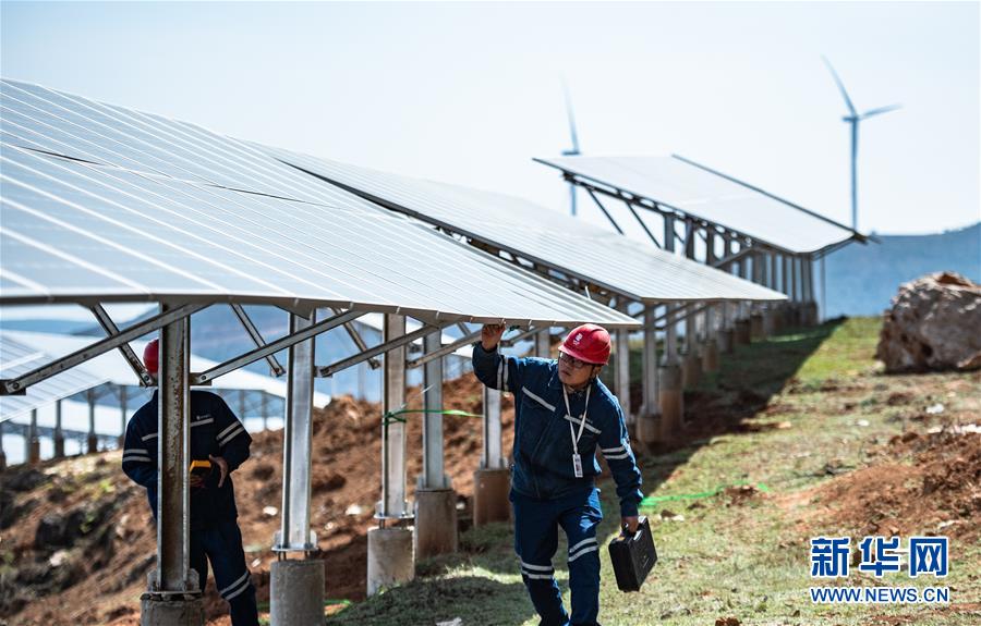 贵州金元公司工作人员对斗古瓦厂光伏发电板进行巡检(4月28日摄)。新华社记者 陶亮 摄