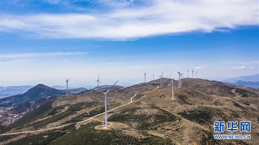 威宁彝族回族苗族自治县龙街镇的风力发电设备(4月26日摄,无人机照片)。新华社记者 陶亮 摄