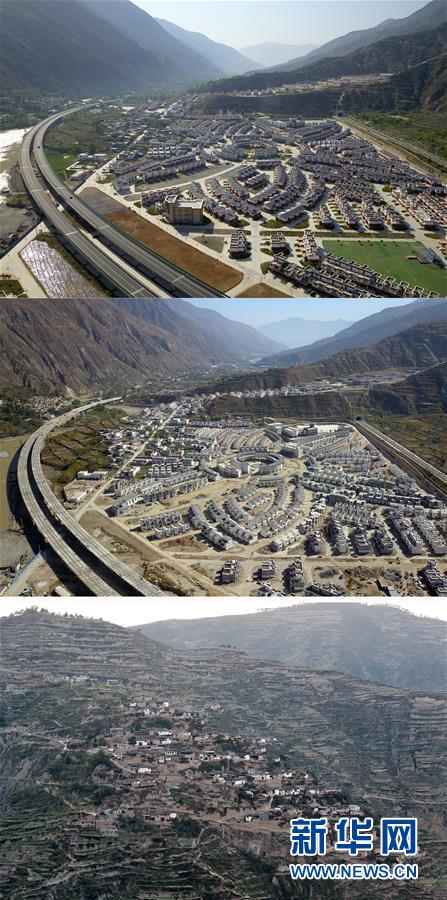 拼版照片:上图为4月28日拍摄的陇南市武都区坪垭藏族乡安置区全景(无人机照片);中图为2018年10月31日拍摄的建设中的坪垭藏族乡安置区全景(无人机照片);下图为2016年9月1日拍摄的搬迁前的陇南市武都区坪垭藏族乡腰道村。