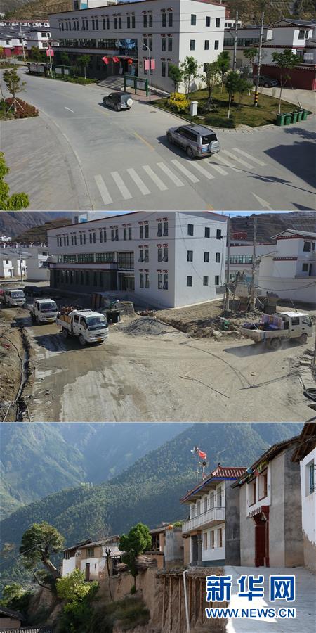 拼版照片:上图为4月27日拍摄的陇南市武都区坪垭藏族乡安置区道路(无人机照片);中图为2018年10月31日拍摄的建设中的坪垭藏族乡安置区道路(无人机照片);下图为2016年9月1日拍摄的搬迁前的陇南市武都区坪垭藏族乡腰道村道路。新华社记者 范培珅 摄