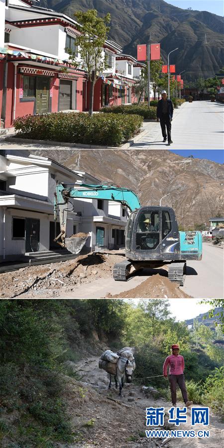 拼版照片:上图为4月28日拍摄的陇南市武都区坪垭藏族乡安置区;中图为2018年10月31日拍摄的建设中的坪垭藏族乡安置区;下图为2016年9月1日拍摄的搬迁前的陇南市武都区坪垭藏族乡腰道村道路。新华社记者 范培珅 摄