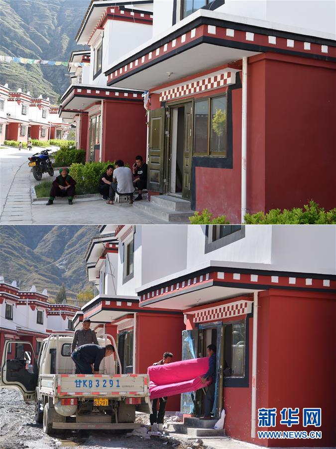 拼版照片:上图为4月27日拍摄的陇南市武都区坪垭藏族乡安置区群众日常生活景象;下图为2018年10月31日,群众搬入坪垭藏族乡安置区的新房。新华社记者 范培珅 摄