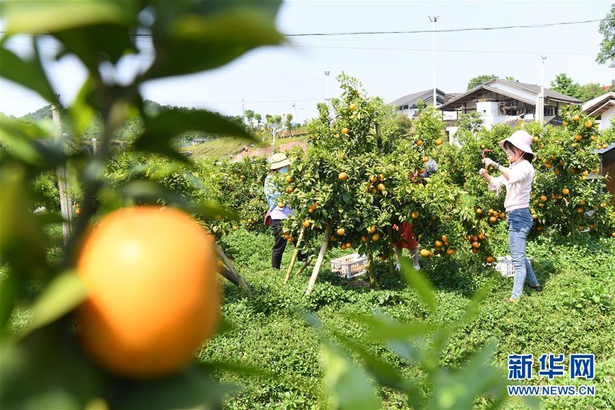 4月29日,在重庆忠县“三峡橘乡”田园综合体内,游客在果园内游玩。新华社记者 唐奕 摄