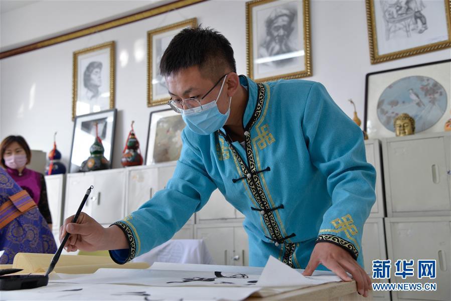 4月29日,科尔沁右翼前旗第一中学学生在教室里练习蒙古文书法。 内蒙古自治区兴安盟科尔沁右翼前旗第一中学是一所民族学校。近日,随着开学复课,学校里独具特色的民族文化课程也陆续开课。 新华社记者 徐钦 摄
