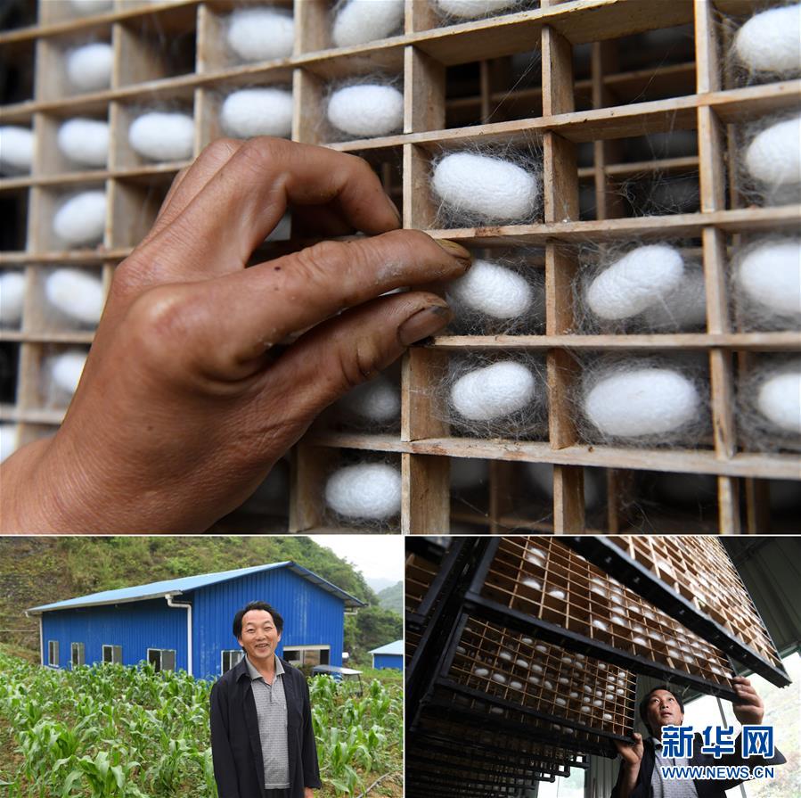 这是一张拼版照片(图片均为2020年4月23日摄),上图为:在广西隆林各族自治县者浪乡么窝村龙洞平屯,村民熊卫成在分拣蚕茧。熊卫成依靠种桑养蚕等产业,2019年实现脱贫;下左图为:熊卫成站在蚕房前;下右图为:熊卫成在查看蚕茧。 新华社记者陆波岸摄
