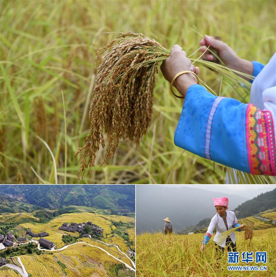 这是一张拼版照片(图片均为2019年10月11日摄),上图为:在广西龙胜各族自治县龙脊镇古壮寨,村民潘鸿参在收割稻谷。潘鸿参一家依靠水稻种植等产业实现脱贫;下左图为:广西龙胜各族自治县龙脊镇古壮寨秋色(无人机照片);下右图为:潘鸿参(前)在收割稻谷。 新华社记者陆波岸摄