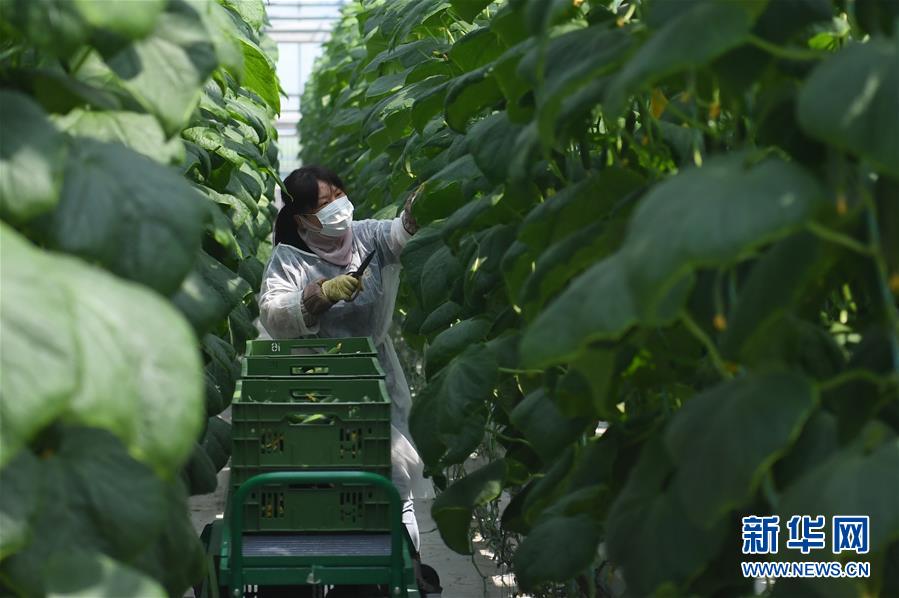 4月30日,南和县一家现代农业示范园区的工人在智慧温室采摘黄瓜。 近年来,河北省南和县积极培育壮大现代农业示范园区、家庭农场等新型现代农业经营主体,通过集约化、规模化、产业化经营激活农业发展潜能,灵活多样创造就业岗位,就近吸纳当地农民变身农业“产业工人”,有效促进农业增效和农民增收。 新华社记者 朱旭东 摄
