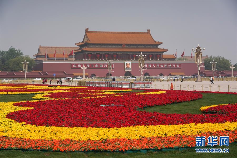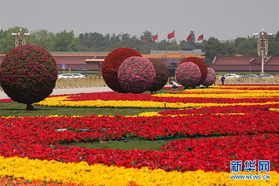 4月30日拍摄的天安门广场西侧花坛。 近日,天安门广场东西两侧花坛布置完成,迎接即将到来的“五一”国际劳动节。 新华社记者 鞠焕宗 摄