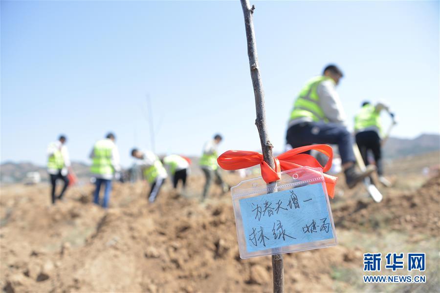 4月30日,一棵小树苗上挂着写有“为春天增一抹绿”的寄语卡。 当日,中建一局东北区域公司时代广场党支部,联合呼和浩特市多个党支部,来到呼和浩特市赛罕区榆林镇西干丈村,共同举行“结对共建绿色家园”植树活动。 新华社记者王靖 摄