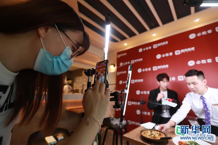 4月29日,工作人员在广州一家餐饮门店里直播。 “五一”国际劳动节将至,电商主播这个有着新经济烙印的职业人群坚守在自己的岗位上。在线上经济与互联网产业高速发展的背景下,越来越多的年轻人朝着数字化的职业方向发展。 新华社记者 卢烨 摄