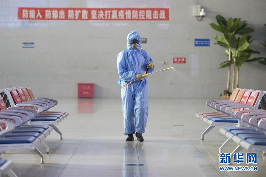 4月30日,在绥芬河火车站候车大厅,工作人员刘俊华在进行消杀作业。 “五一”小长假将至,在黑龙江绥芬河,有一群人依然坚守在抗疫岗位上,用自己的辛苦付出,助力疫情防控。 新华社发(张涛 摄)