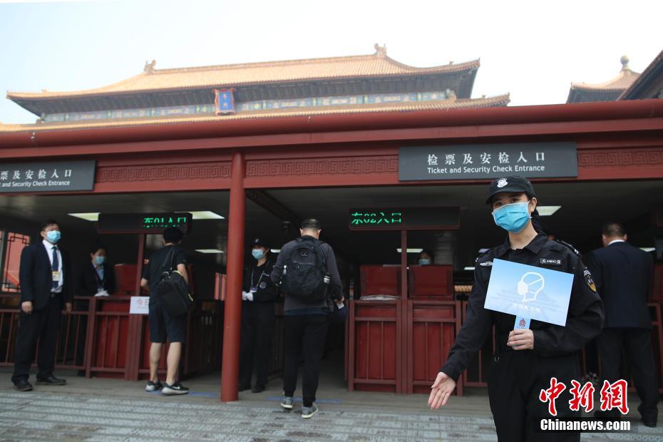 5月1日,工作人员提示游客佩戴口罩。当日起,北京故宫博物院恢复开放,实行预约、错峰、限流参观。故宫此次每日限流从原本的8万人次降低到每日5千人次。目前,故宫博物院门票只支持网上实名制预约购票,不支持现场购票。中新社记者 盛佳鹏 摄