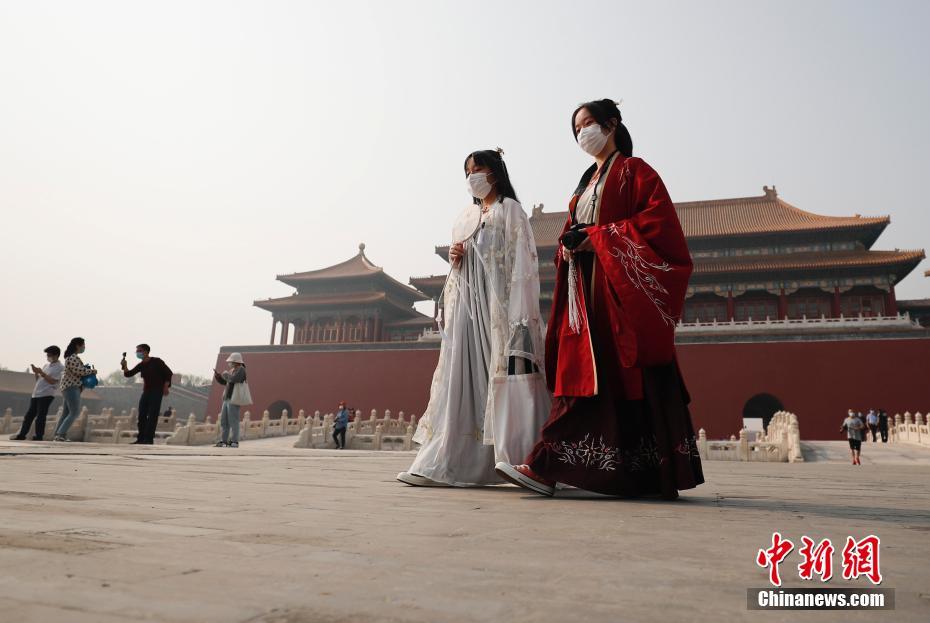 5月1日,身穿汉服的游客在故宫游览。当日起,北京故宫博物院恢复开放,实行预约、错峰、限流参观。故宫此次每日限流从原本的8万人次降低到每日5千人次。目前,故宫博物院门票只支持网上实名制预约购票,不支持现场购票。中新社记者 杜洋 摄