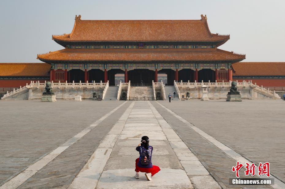 5月1日,较早进入故宫的游客抢拍故宫“无人”美景。当日起,北京故宫博物院恢复开放,实行预约、错峰、限流参观。故宫此次每日限流从原本的8万人次降低到每日5千人次。目前,故宫博物院门票只支持网上实名制预约购票,不支持现场购票。中新社记者 杜洋 摄