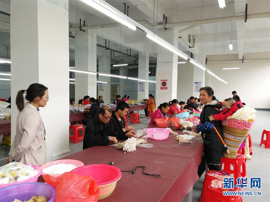 贵州铜仁市沿河县沙沱社区搬迁群众在大龙开发区援建的扶贫车间里工作(4月25日摄)。新华社记者 向定杰 摄