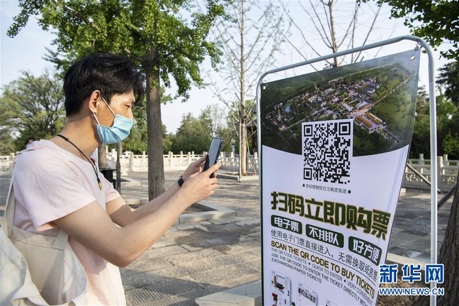 5月1日,游客在山西太原晋祠公园扫码购票。 当日是“五一”小长假第一天,全国各地群众以不同方式放松心情,欢度假日。 新华社记者 杨晨光 摄