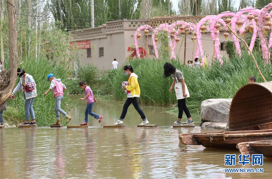 5月1日,在新疆喀什稻香泉村内,游客们在过河。 当日是“五一”小长假第一天,全国各地群众以不同方式放松心情,欢度假日。 新华社记者 高晗 摄