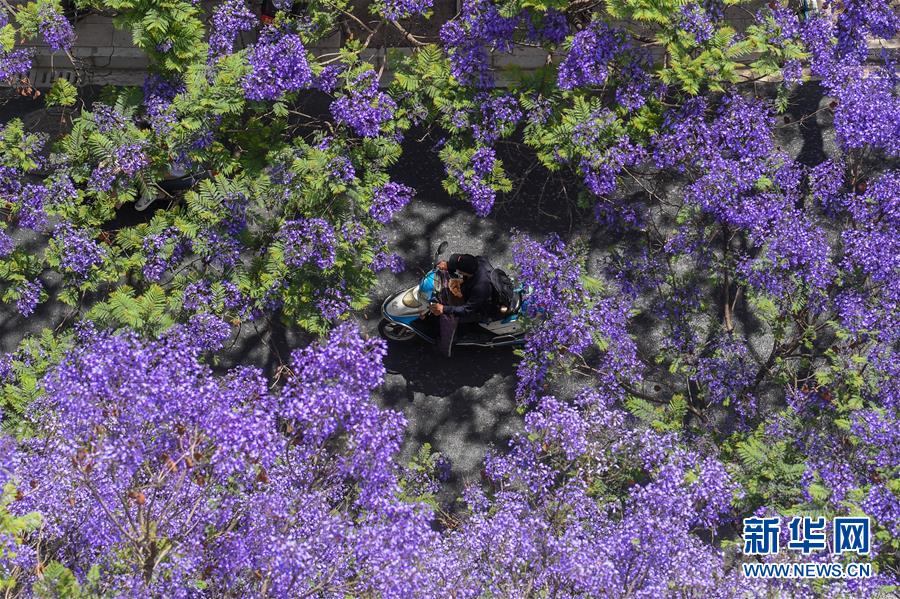 这是5月2日在昆明市教场中路拍摄的蓝花楹。 近日,云南省昆明市部分街区的蓝花楹竞相开放,为春城增添靓丽风景。 新华社记者 蔺以光 摄
