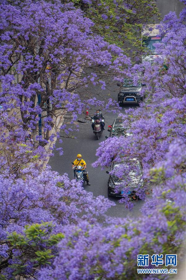 这是5月2日在昆明市教场中路拍摄的蓝花楹。 近日,云南省昆明市部分街区的蓝花楹竞相开放,为春城增添靓丽风景。 新华社记者 胡超 摄