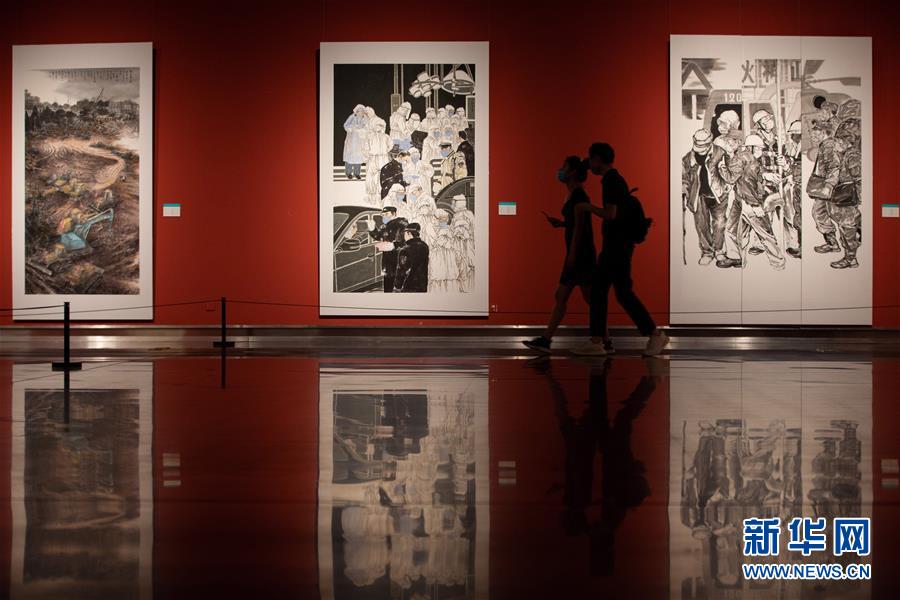 5月2日,观众在位于南京的江苏省美术馆观看江苏省抗疫主题美术书法精品展。 “五一”假日期间,人们以多种方式放松心情、享受假日。 新华社发(苏阳 摄)