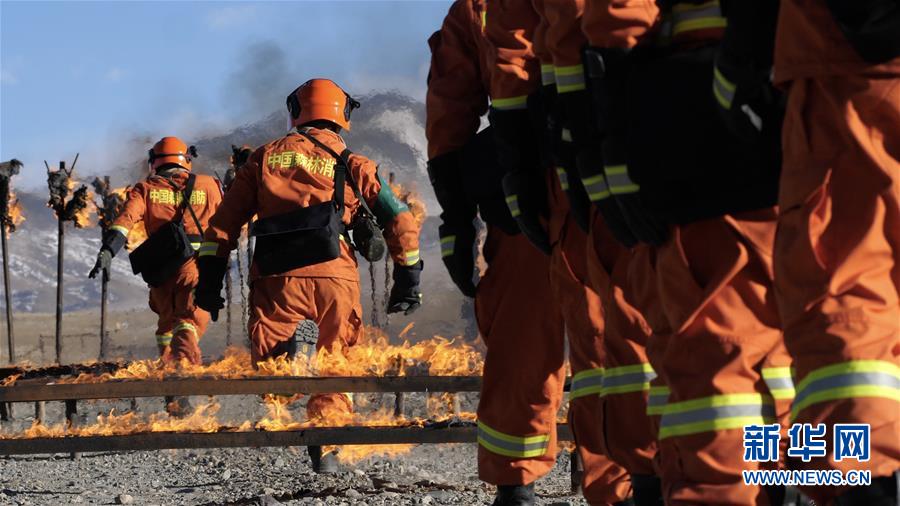 那曲大队消防指战员进行跨火栏、穿火林训练(2019年12月25日摄)。新华社记者 李桢宇 摄