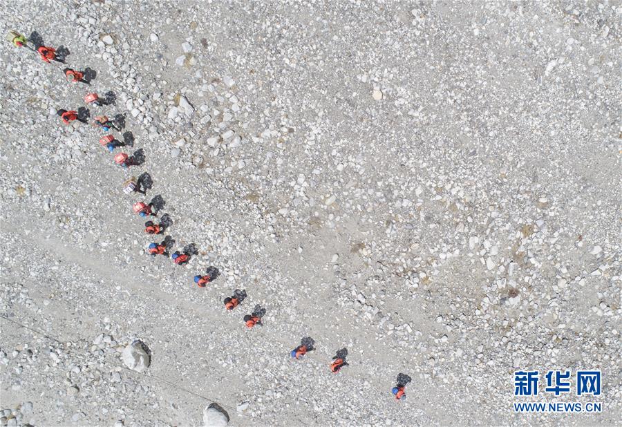 薛强强和队友从珠峰大本营出发,前往二本营(5月2日摄,无人机照片)。 新华社记者 晋美多吉 摄