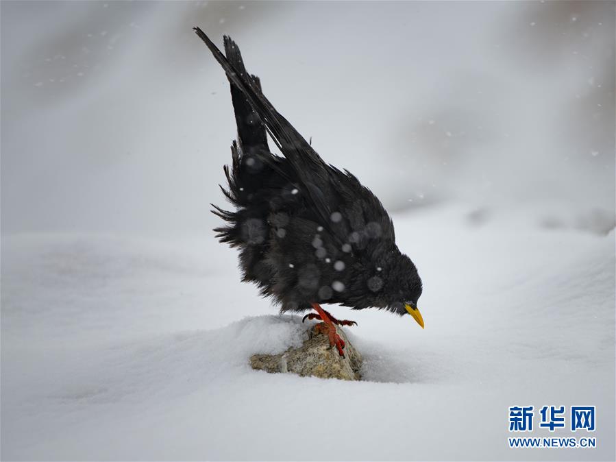 在珠峰国家级自然保护区内栖息的黄嘴山鸦(5月2日摄)。 珠穆朗玛峰山区高寒缺氧。然而,这里却栖息着一群雪域精灵。 新华社记者 普布扎西 摄