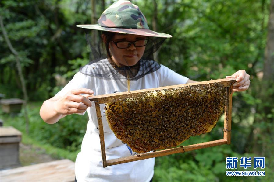 在泸溪县兴隆场镇甘田坪村,杨春竹查看蜜蜂繁育情况(4月29日摄)。 1983年出生于湖南省湘西土家族苗族自治州泸溪县兴隆场镇甘田坪村的杨春竹曾在上海从事文职工作,2015年回到家乡甘田坪村。性格开朗的杨春竹喜欢在朋友圈分享乡村生活:挖竹笋、剁辣椒、养蜜蜂……有朋友找她购买山货,她在帮助朋友的时候,开始把家乡农产品向外推广,发现了创业的门路。如今,杨春竹的生意越做越大,她收购村民的农产品,带动十户贫困户一起致富。“希望我不断努力成为榜样,带领乡亲越过越好。”杨春竹说。新华社发(陈振海 摄)