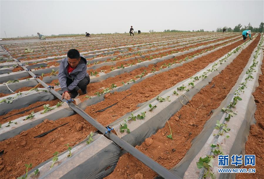 5月3日,卢龙县双望镇四新庄村的村民在田间调试浇灌烟薯秧苗的滴灌设备。 近年来,河北省卢龙县大力调整农业种植结构,积极引导农民采用“滴灌+覆膜”等技术种植红薯新品种烟薯,增加收入。据介绍,目前该县烟薯种植面积有4万多亩。 新华社记者杨世尧摄