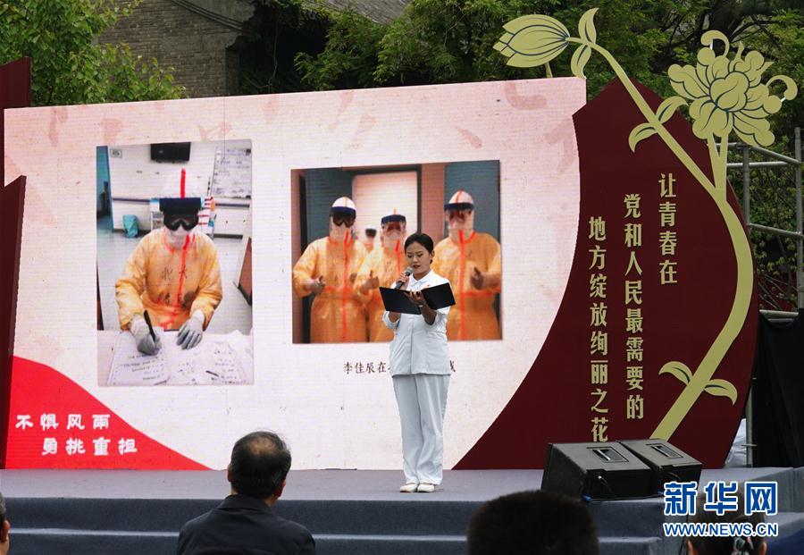 5月4日,北京大学援鄂医疗队“90后”党员代表在北大五四青春诗会朗诵。 当日,北京大学通过与武汉大学、西藏大学、北京大学研究生支教团联合举办纪念五四运动升旗仪式以及北京大学2020年五四青春诗会等活动,传承五四精神,纪念五四青年节。 新华社记者 张晨霖 摄