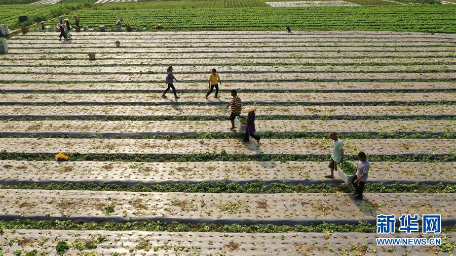 5月4日,在贵州省铜仁市玉屏侗族自治县新店镇洞坪村,村民在采收生菜(无人机照片)。 近日,贵州省铜仁市玉屏侗族自治县新店镇洞坪村坝区生菜迎来丰收季,村民们加紧收获。据了解,洞坪村坝区生菜每年可种植4批,带动农户户均增收3000元以上。 新华社发(胡攀学 摄)
