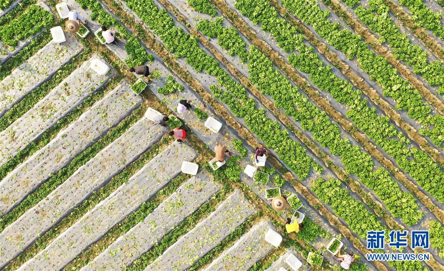 5月4日,在贵州省铜仁市玉屏侗族自治县新店镇洞坪村,村民在采收生菜(无人机照片)。 新华社发(胡攀学 摄)