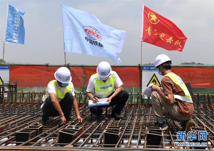 5月4日,在广西南宁至崇左高铁龙怀双线大桥建设工地,施工人员在为连续梁浇筑作业做准备。 新华社记者 陆波岸 摄