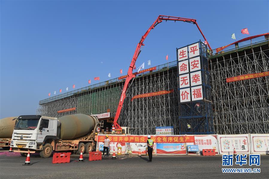 5月4日,在广西南宁至崇左高铁龙怀双线大桥建设工地,施工人员在进行连续梁浇筑作业。新华社记者 陆波岸 摄
