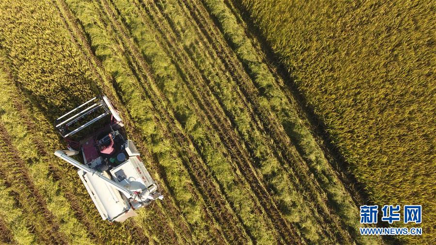 5月5日,海南省琼海市博鳌镇培兰村的农民在抢收早稻(无人机照片)。 当日是立夏节气,各地农民抢抓农时在田间忙碌。 新华社发(蒙钟德 摄)