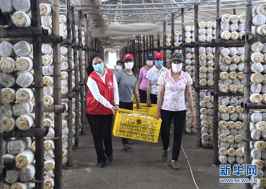 唐莉(左一)在平乐县张家镇食用菌生产基地帮工人搬运袖珍菇(5月4日摄)。新华社记者 周华 摄