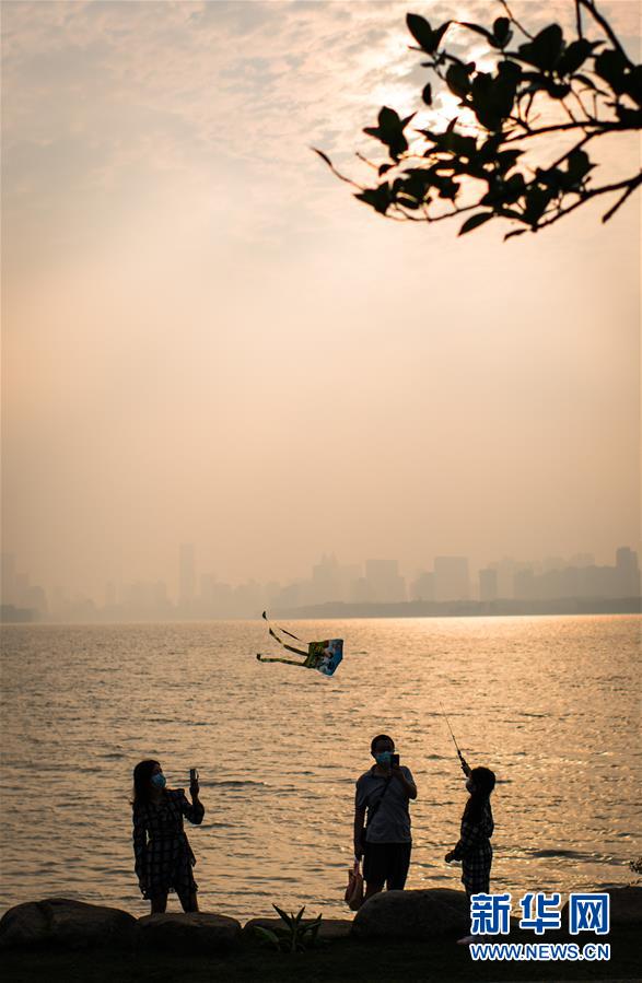 5月5日,人们在武汉东湖边欣赏落日。 新华社记者 肖艺九 摄
