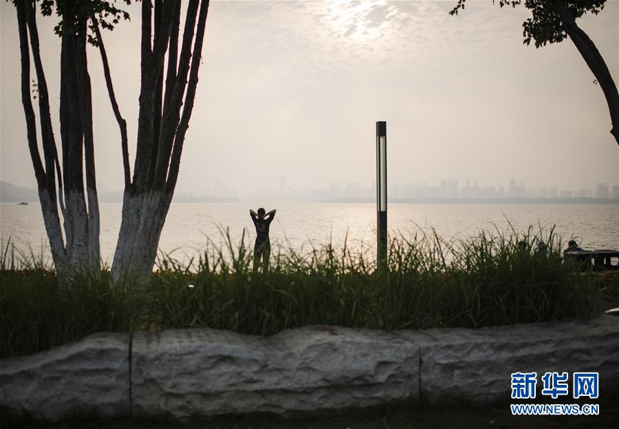 5月5日,人们在武汉东湖边欣赏落日。 新华社记者 肖艺九 摄