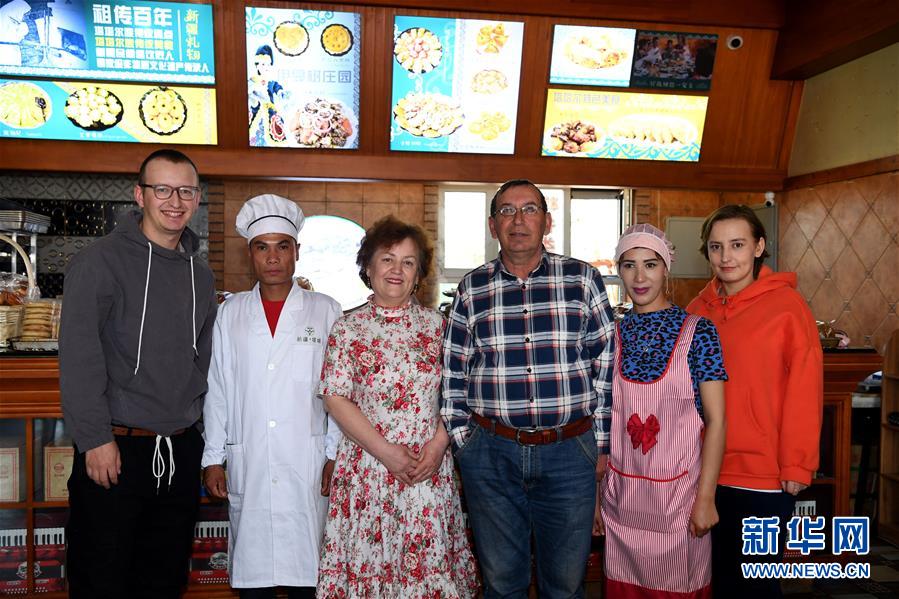 4月17日,新疆塔城市中心的洋婆婆食品坊,依巴达提·阿布力孜(右二)与女主人再屯娜·卡利穆瓦(左三)一家合影。新华社记者 沙达提 摄