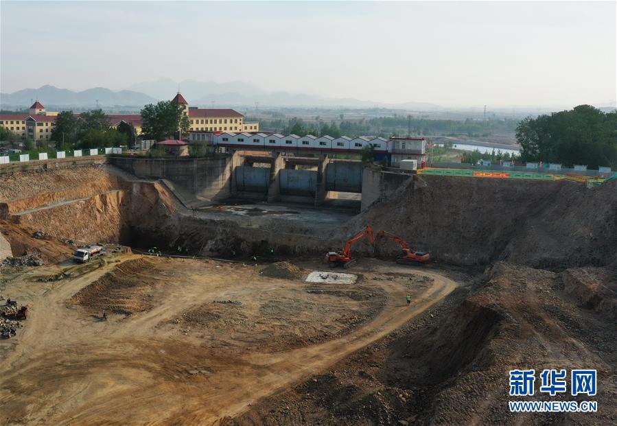 5月5日,工人在洋河水库除险加固工程工地施工(无人机照片)。新华社记者 杨世尧 摄