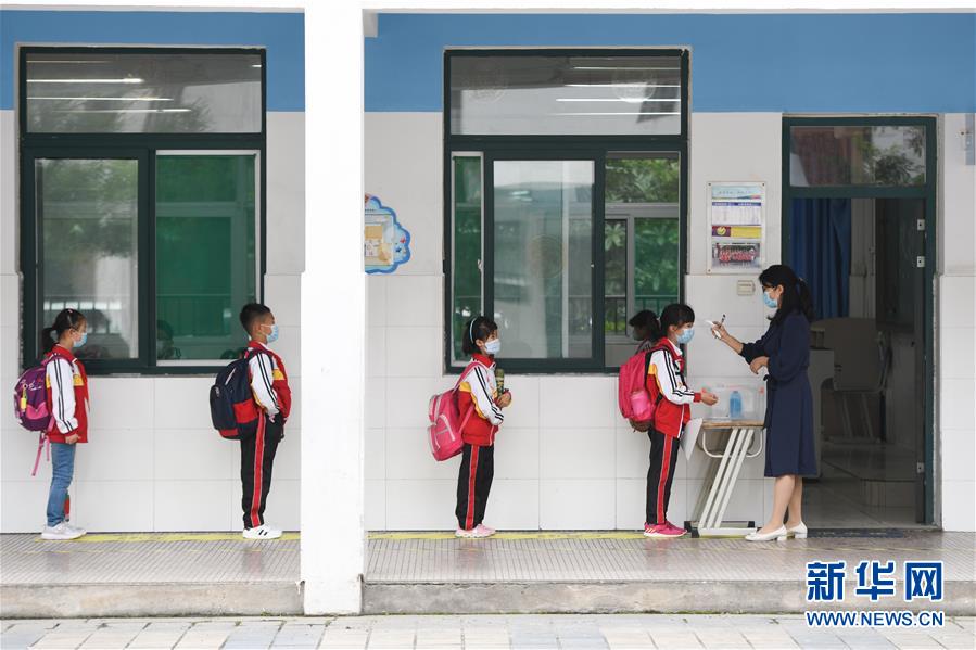 5月6日,合肥师范附小二年级的学生在教室门口接受体温测量。 当日,安徽省合肥市小学低年级(一、二、三年级)开学复课。至此,合肥市小学、初中、高中各年级全部复课。 新华社记者 张端 摄