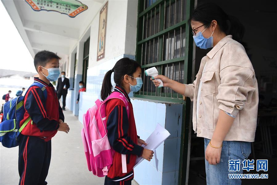 5月6日,合肥市肥西县花岗学区中心学校一年级的学生在班级门口接受体温测量。 当日,安徽省合肥市小学低年级(一、二、三年级)开学复课。至此,合肥市小学、初中、高中各年级全部复课。 新华社记者 刘军喜 摄