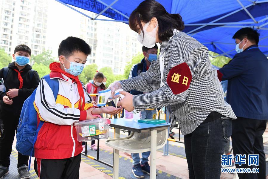 5月6日,合肥师范附小三年级的学生(前左)入校时接受体温测量。 当日,安徽省合肥市小学低年级(一、二、三年级)开学复课。至此,合肥市小学、初中、高中各年级全部复课。 新华社记者 张端 摄