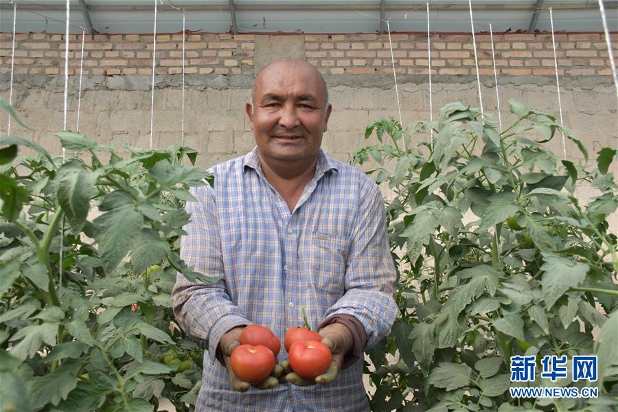 在新疆阿克陶县昆仑佳苑社区旁,65岁的吐尔干·阿依达尔在自家蔬菜大棚里展示成熟的西红柿(4月18日摄)。新华社记者 高晗 摄