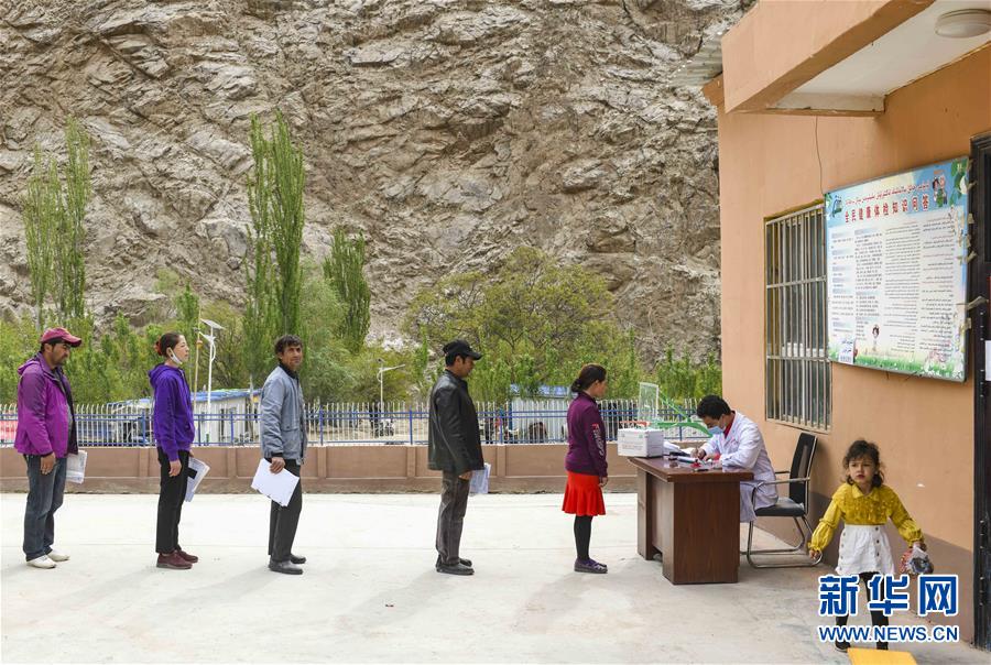 在新疆叶城县西合休乡亚尔阿格孜村的卫生室,村民排队问询体检反馈信息(5月2日摄)。新华社记者 胡虎虎 摄