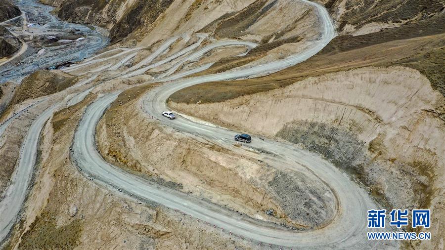 新疆叶城县西合休乡卫生院的医护人员驾车带着医疗设备行驶在盘山公路上(5月2日摄,无人机照片)。新华社记者 胡虎虎 摄