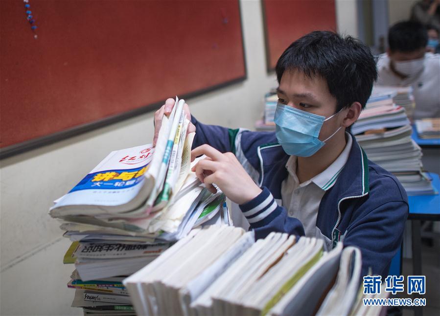 5月6日,武汉市第六中学的高三年级学生在整理备考材料。 当日,武汉首批121所学校高三年级正式复学,学生返校上课。据了解,开学前,所有校园均开展了卫生清洁和预防性消杀工作,所有学生返校前须进行健康检测。 新华社记者 肖艺九 摄