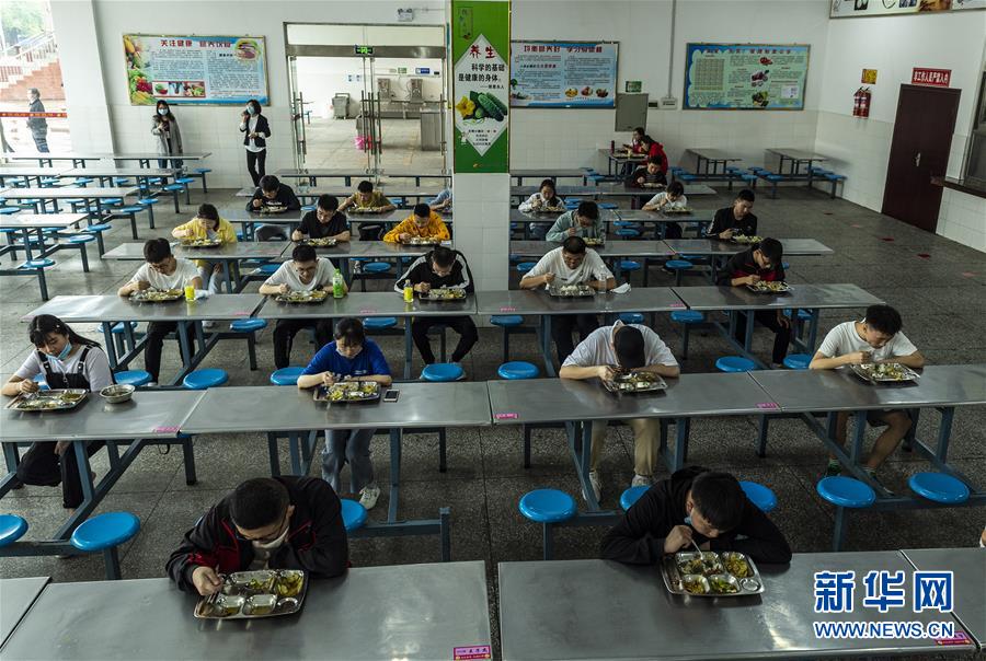5月6日,湖北省宜昌市秭归县第二高级中学的高三学生按姓名指示牌就座进餐。 当日,湖北省普通高中毕业年级(含中职学校和技工学校的毕业年级)学生统一开学。 新华社发(郑家裕 摄)