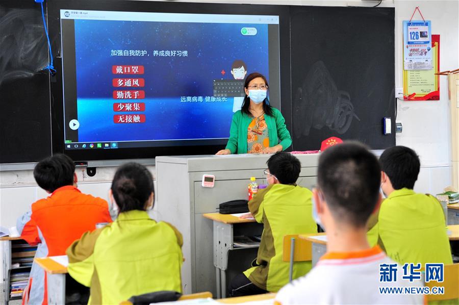 5月6日,湖北省宜昌市夷陵区东湖高中的老师在“复学第一课”上为高三学生宣讲疫情防控知识。 当日,湖北省普通高中毕业年级(含中职学校和技工学校的毕业年级)学生统一开学。 新华社发(张国荣 摄)