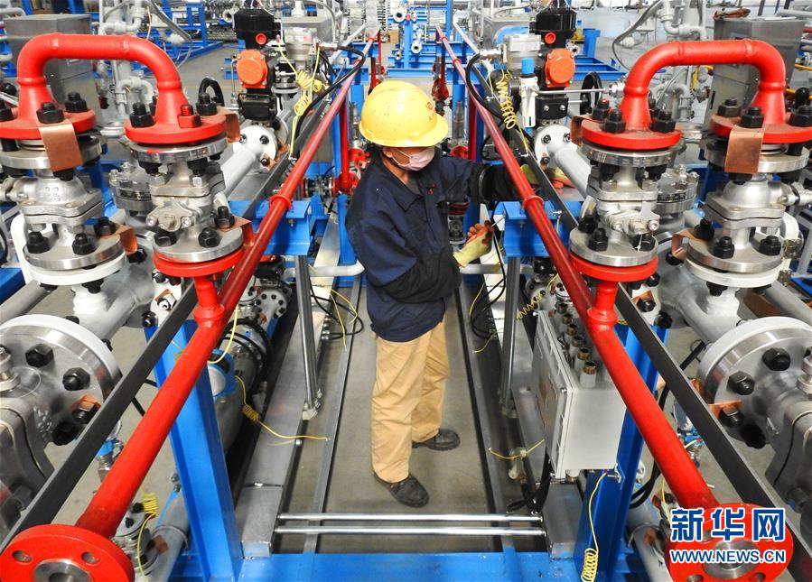 5月6日,在位于连云港海州经济开发区新浦工业园的连云港天邦科技开发有限公司,工人在安装撬装式油品装卸设备。 “五一”假期过后,各地多家工业企业恢复正常生产状态,开足马力加紧订单生产,满足市场需求。 新华社发(耿玉和 摄)